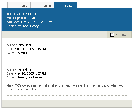 You can add project notes through the History tab of its Project page. Notes can be written by users who are assigned to project tasks. Notes are also entered automatically by the system to track events that occur during the project’s lifecycle. For example, when you create a project, this event is automatically recorded as a note and displayed in the History tab.