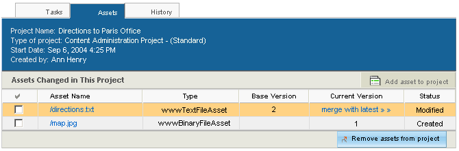 The versioning system handles cases where two people edit the same asset in different projects. If a project leaves its Author task unassigned, two or more users might edit that project asset at the same time. In this case, the system does not detect any version conflict. The project allows only one user to save changes to the asset. Subsequent attempts by other users to save changes to the same asset yield a Concurrent Update Exception message and their changes are not saved.