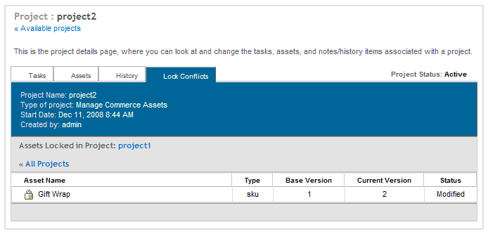 If project deployment is blocked by other projects, you can use the project’s Lock Conflicts tab in order to determine which other projects might have locks on its assets. For example, two projects—project1 and project2—might concurrently have the same asset. If project1 is already approved for deployment, it holds an exclusive lock on the shared asset. Consequently, attempts to deploy project2 yield the following error message.