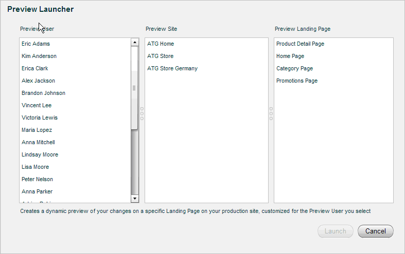 3. Click Launch to start a preview session that uses the selected landing page, user profile, and optionally, site.