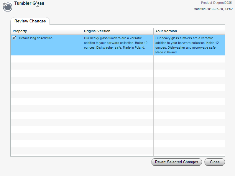 (Optional) To undo a change, click the checkbox next to the name of a changed property, then click Revert Selected Changes.