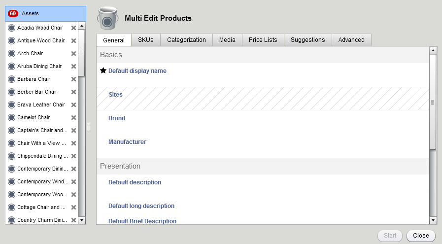 The same restrictions that apply to editing properties individually also apply to Multi Edit operations. For example, you cannot edit read-only properties, like a product’s Sites collection, or properties that your profile’s roles do not allow you to view or edit. Additionally, you cannot use Multi Edit to change the following asset properties:
