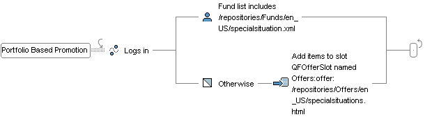 This scenario is made up of one segment or string of actions called Portfolio Based Promotion. According to this scenario, once a visitor logs in, if that visitor does not have the Quincy Special Situation fund in his or her portfolio, the Special Situations Offer image will display on his or her home page.