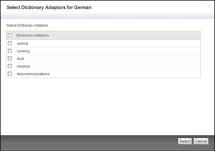 Each selected language (including English, which is selected by default) has a Dictionary Adaptors link. Dictionary adaptors contain industry-specific terms that are not part of the main Search dictionary. Click the link to select dictionary adaptors that should be included for the language. Different adaptors are available for different languages; the example that follows is for German.