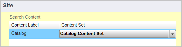 The Search Content table shows the content labels you created in Global Settings. Select a content set to associate with each label. If you do not want a content label to be available on the site you are configuring, you can leave the content set blank.