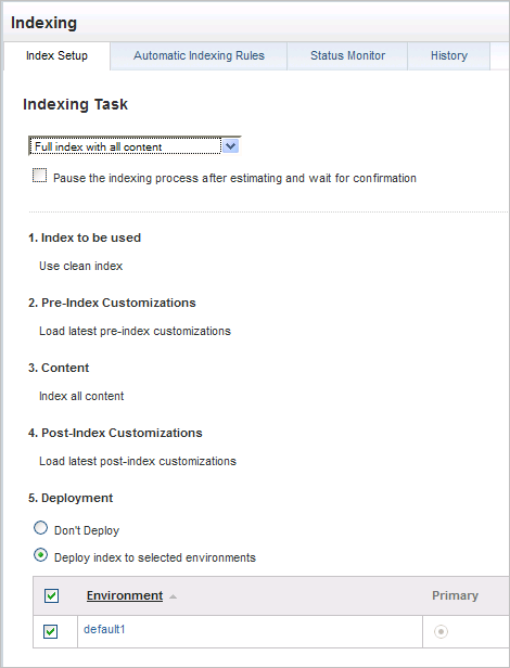 Select deployment environments. Some indexing options allow you to deploy the indexed content when indexing is concluded. Check the environments to which you want to deploy the index.