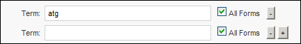 Term—Enter a single word for which to inspect content. To add more terms, click the + icon. To remove terms, click the – icon. Uncheck the All Forms box to search only for literal matches on the term you enter.