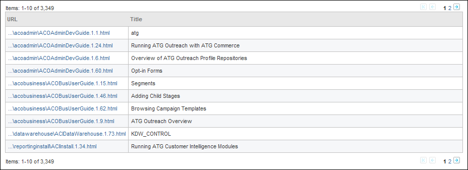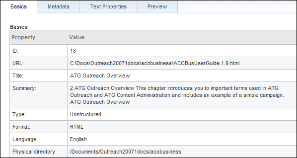 Content Inspection allows you to view individual content items in your index, along with information about that item, such as associated metadata or text properties, how the item would be displayed on a site, and the XHTML representation (for structured data only). Note that this feature does not replicate how a search would be performed by a user on your site (for information on how you can do this, see the ATG Merchandising Guide for Business Users).