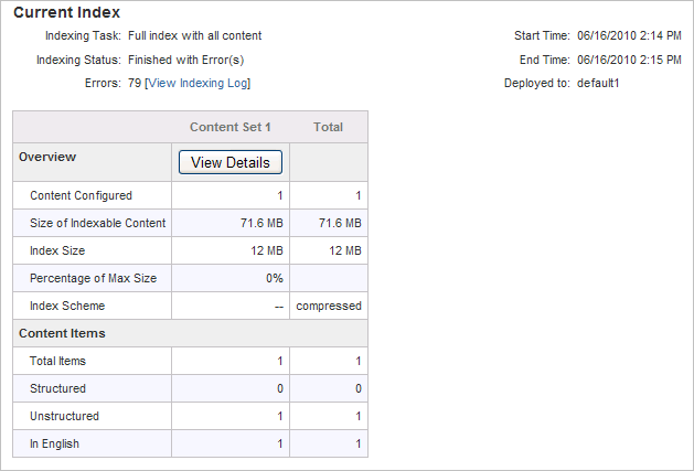 The content summary tab provides high-level information about your index and the content items it includes. You must have created at least one index before this page can be used.