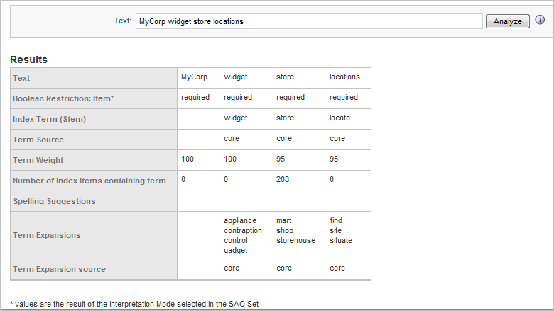 While the Text Processing tab shows how indexed content is analyzed, the Search Text Analysis tab shows how query text is processed by the search engine. To do this, it uses Search Analysis Option Sets, which are analogous to the settings that either appear in your Web site’s search user interface or are configured in your Web site’s form handlers. This allows you to experiment with how these settings affect your users’ searches without having to change your site. It is important to understand that these settings should be configured the same as they are on your Web site if you want to troubleshoot a search issue that you have observed on your Web site. Inspection allows you to vary settings in a controlled, non-production environment in order to determine how best to solve problems or make improvements to your site.