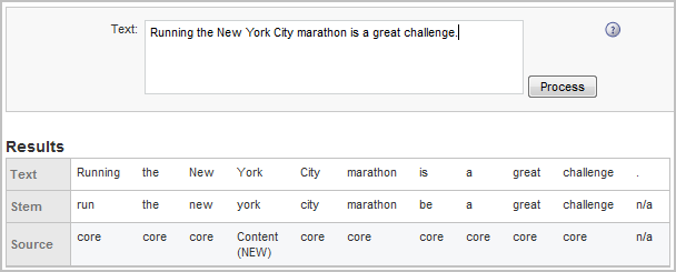 The source, which is either a dictionary or content you have indexed. If the term exists in neither the content nor any loaded dictionaries, that word is marked “Content (NEW)” in the processing results.