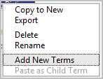 Right-click the dictionary or term to which you want to add a term, and select Add New Term from the menu.