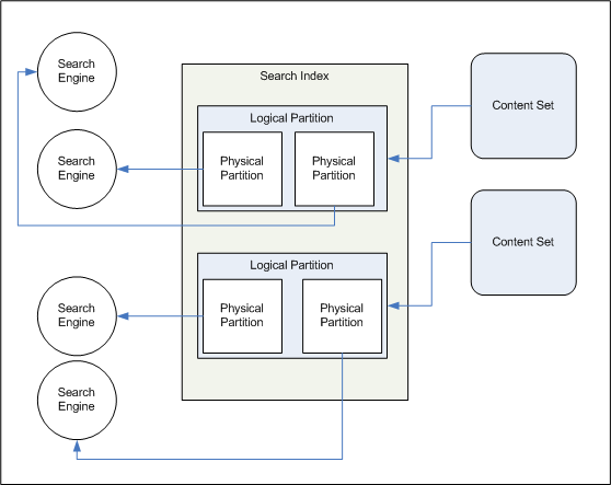 modules.Search index—The searchable content deployed on your sites. An index is composed of one or more logical partitions, each of which is associated with content configured in Search Administration. Each logical partition is composed of one or more physical partitions. Each physical partition requires a search engine to serve answers from that partition. Each engine has its own copy of the physical partition it serves.