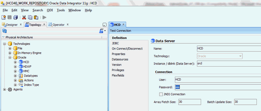 In ODI, log in to HCD work repository and navigate to Topology > Physical Architecture > Technologies > Oracle.