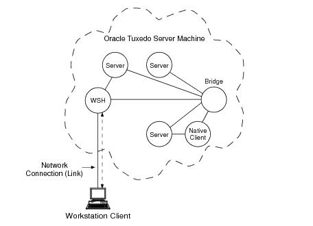 The Workstation component of the Oracle Tuxedo system allows application clients to reside on a machine that does not have a full server-side installation, that is, a machine that does not support any administration or application servers. As shown in the following figure, all communication between a Workstation client—an application client running on a Workstation component—and the server application takes place over the network.A Workstation client, whether run on a Windows or UNIX system, has access to most of the client ATMI, although a Workstation client does not have all the access privileges available to a native client (that is, a client running on the same machine on which the server program is running). However, both types of clients can do the following:
