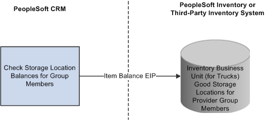 This diagram illustrates how the integration between PeopleSoft CRM and your inventory system supports storage location balance checking:
