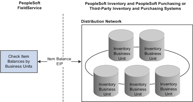 You can also check on-hand balances for the inventory business units included in the distribution network defined for your field service operations. The PeopleSoft CRM system uses the Item Balance EIP to retrieve the quantity that is available and on-hand balance information from the appropriate inventory business units defined in PeopleSoft Inventory or your third-party inventory system. The balance information appears on the Item Balance by Business Units page in PeopleSoft CRM.