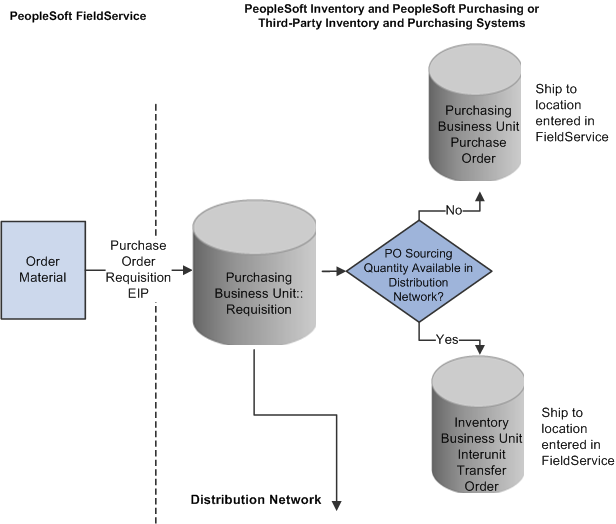 If your implementation includes PeopleSoft Purchasing and PeopleSoft Inventory, sourcing processes in PeopleSoft Purchasing determine whether the order can be partially or completely fulfilled by an interunit transfer from the inventory business units in your distribution network or whether a purchase order must be placed with an external vendor.