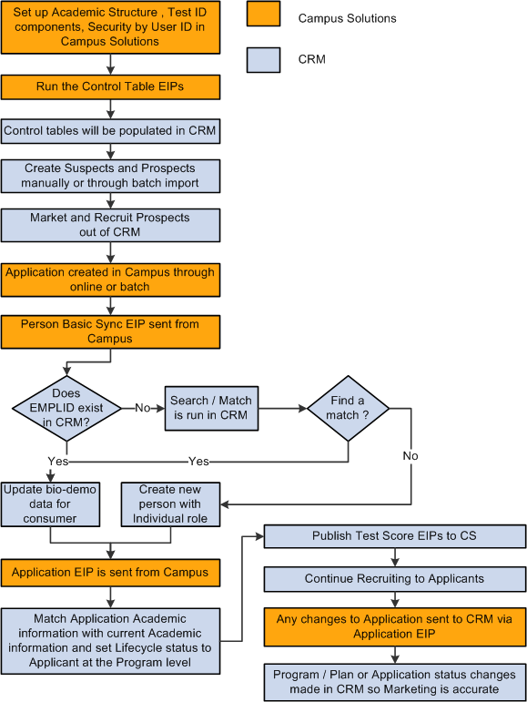 Because suspects and prospects can be created in CRM, typically they are not created in Campus Solutions. The reason for this is to reduce the number of prospective students in the Campus Solutions database who might not subsequently enroll. However, it is still possible to create suspects and prospects in Campus Solutions; these are synced to CRM through the existing EIPs.