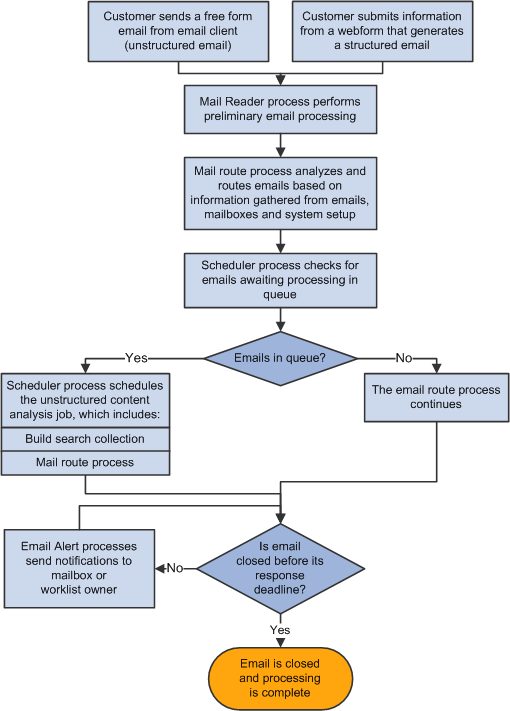 The mail reader process (RB_MAIL_READ) does all of the basic email handling that is common to both structured and unstructured email. Among other things, it fetches emails from external mail servers, saves the data in the PeopleSoft system, identifies email senders, associates relevant mailbox data with emails, and classifies emails as structured or unstructured.