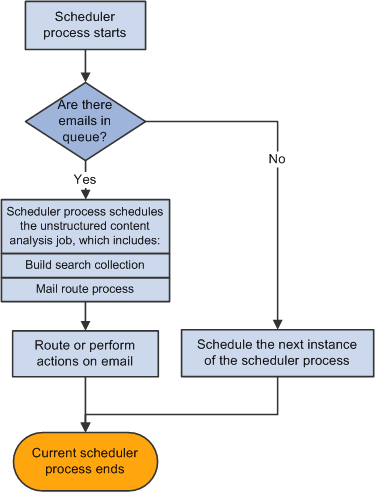The scheduler process (RB_CHECKUQ) determines whether any emails are awaiting further processing. If there are emails in queue, it schedules the unstructured content analysis job (PRCEMAIL), which includes the following two processes.