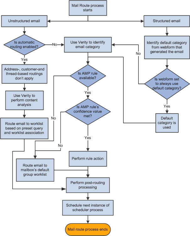 The mail route process (RB_MAILROUTE) is responsible for analyzing and routing emails. It checks emails' eligibility for address or domain-based routing, customer-based routing, thread-based routing and keyword-based routing. It carries out necessary email processing based on the email type (structured or unstructured). At the end, either some actions are preformed on emails automatically or they are routed to appropriate group worklists to be processed by agents.