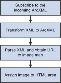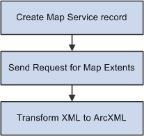You create the map service record in the Map Definition component. The PeopleSoft system transforms the XML to ArcXML and sends the map service information to ESRI. This flowchart illustrates the outbound process flow for map service information: