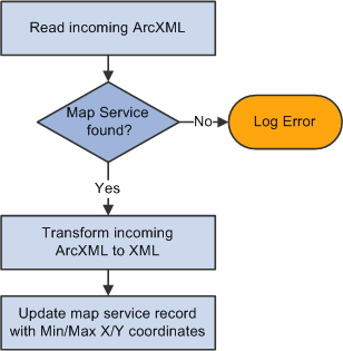 ESRI sends the map service information and the PeopleSoft system reads the incoming ArcXML. If the map service is found, the PeopleSoft system transforms the ArcXML to XML and updates the map service record with the minimum and maximum extents. The minimum and maximum X and Y coordinates appear on the Map Definition page. This flowchart illustrates the inbound process flow for updating the map service record: