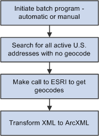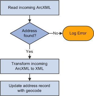 ESRI publishes the geocode for the address or intersection. If no geocode is found, an error is logged. If a corresponding geocode is found, the PeopleSoft system transforms the incoming ArcXML sent by ESRI to XML. The address record is updated with the geocode.