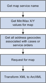 This integration is used to send a list of geocodes from either a case or service order search. A request XML is sent to the ESRI system to generate a map with geocodes that appear as dots. The PeopleSoft system gets the map service name, the minimum and maximum extents for the map, and all address geocodes associated with cases or service orders. It sends the message in ArcXML. This flowchart illustrates the outbound process flow for generating the map: