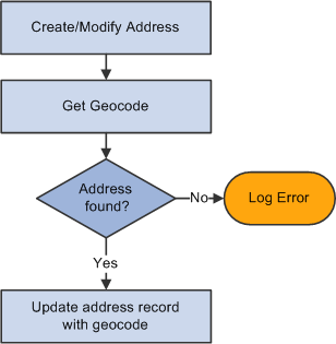 You can obtain geocodes from ESRI in synchronous real time. When you create or modify an address, the system calls ESRI to get the geocode. If the geocode is found, the system updates the address record with the geocode. If no geocode is found, the system logs an error.