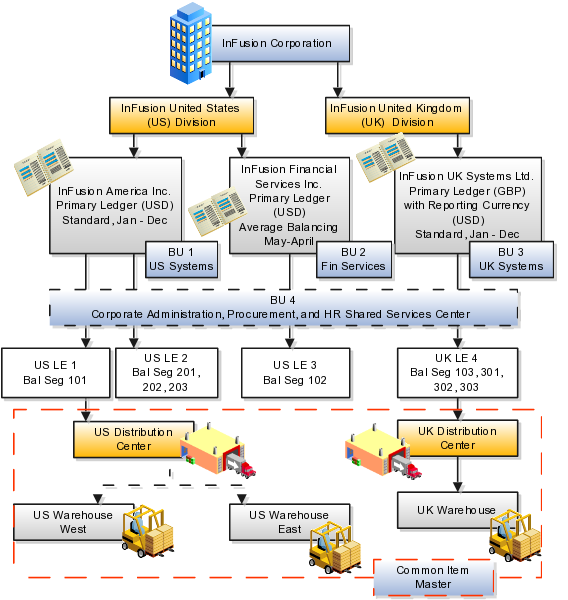 Your company, InFusion Corporation, is a multinational conglomerate that operates in the United States (US) and the United Kingdom (UK). InFusion has purchased an Oracle Fusion enterprise resource planning (ERP) solution including Oracle Fusion General Ledger and all of the Oracle Fusion subledgers. You are chairing a committee to discuss creation of a model for your global enterprise structure including both your US and UK operations.