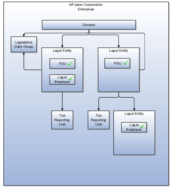 Define legal entities and legal reporting units for business activities handled by the Oracle Fusion Applications. |