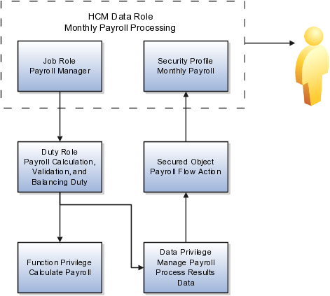 In the following figure, both the payroll administrator and the payroll manager are assigned duty roles with the functional privilege to submit a process or report and the data privilege to view the data for the monthly payroll flow pattern. Both the manager and administrator can perform the same task or have that task reassigned to them.