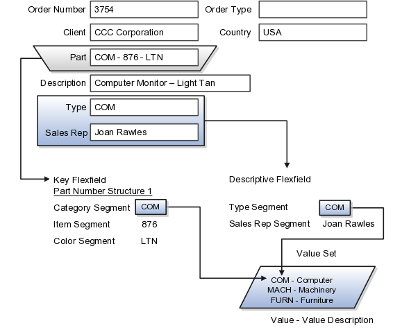 The figure shows the code combination details for the example expense account reflected in the flexfield configuration and the code combination table.