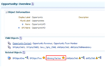 This figure shows the Opportunity object as the primary object for a custom subject area that is created to report on opportunities and winning partner.