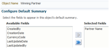 When the Select Fields screen is displayed the administrator user can add or remove Opportunity fields and also add or remove related objects and its fields to the custom subject area.