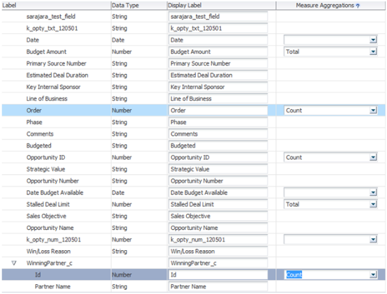 Measures available to a particular type of field may differ depending on the field type. Once you define the measures for the desired fields and publish a custom subject area, you can view and select these fields along with the applied measures when defining the report data in the Oracle Business Intelligence Composer.