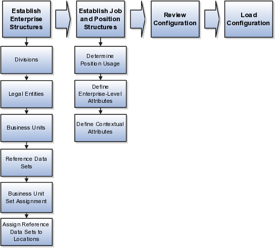 There are product specific implementation activities that are not listed here and depend on the applications you are implementing. For example, you can implement Define Enterprise Structures for Human Capital Management, Project Management, and Sales Management.