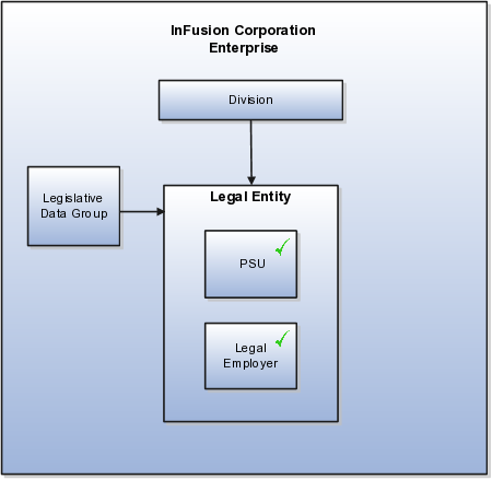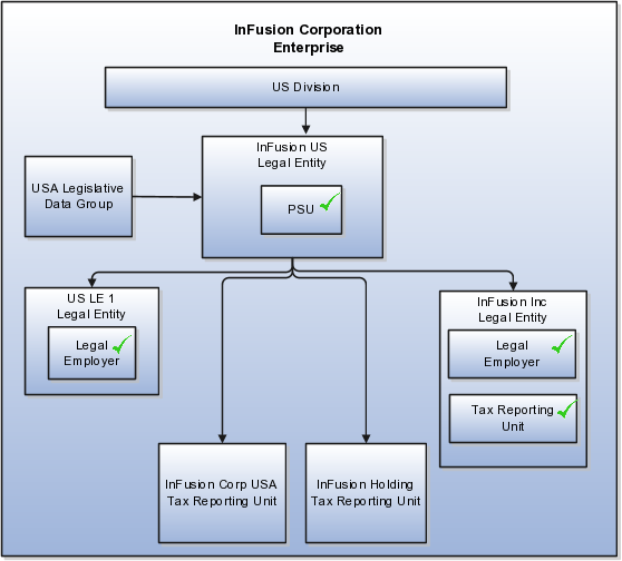 Define legal entities and legal reporting units for business activities handled by the Oracle Fusion Applications. |