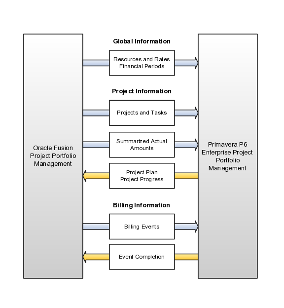 Use Oracle Fusion Project Integration Gateway to integrate Oracle Fusion Project Portfolio Management with Primavera P6 Enterprise Project Portfolio Management. The integration enables project accountants, project billing specialists, and executives to centrally perform project costing, billing, accounting, and executive reporting tasks in Oracle Fusion Project Portfolio Management while enabling each project manager to perform detailed project planning and scheduling in Primavera P6 Enterprise Project Portfolio Management.