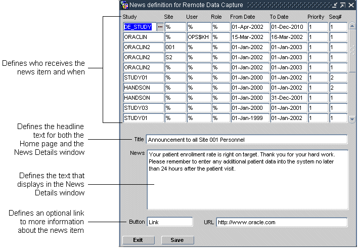 To define the news items, you use the News Definition for Remote Data Capture form in the RDC Administration application. You can customize the news information according to the current study, site, user, role, or date.