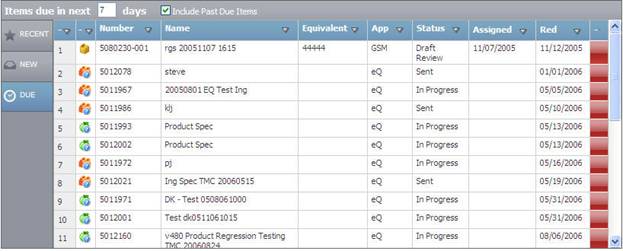 eQ: Due eQ items include all eQs in Sent or In Progress status. The assigned date field is blank.