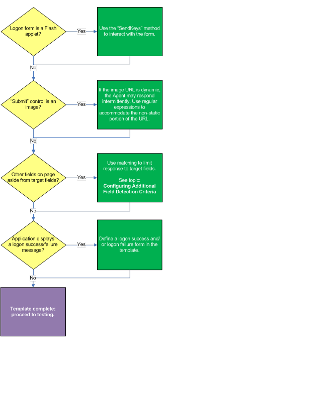 2. エージェントがフォームに応答し、ログオンを実行します。検出が完了して一致するものが見つかった場合、エージェントはテンプレートに格納されている構成に従って、フォームのフィールドおよびコントロールとの対話方法を判断します。通常、エージェントは次の手順を実行します: