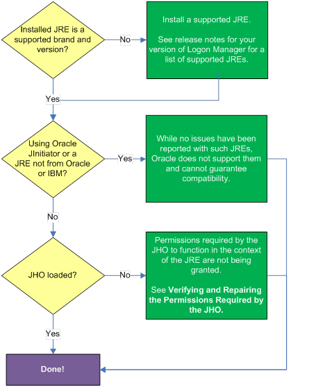 必要な権限がJHOに付与されていない疑いがある場合は、Logon Managerの起動後に、JHOを参照している例外のうち欠落する権限に関する例外がないか、JREのログを確認してください。そのような例外が存在する場合、必要な権限は付与されていません。次のいずれかの原因が考えられます: