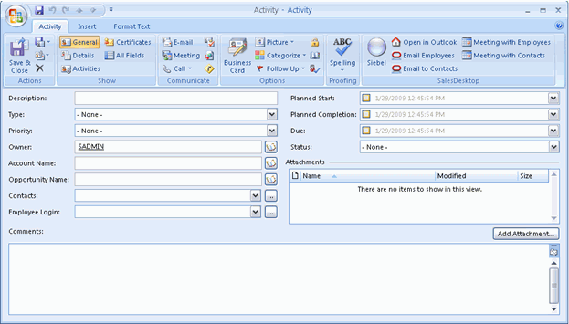 This task is a step in Process of Adding Custom Objects. In this topic, you define the form that Siebel CRM Desktop uses to display the custom object. You configure the custom object to use the custom SBL Activity form that resides in the siebel_basic_mapping.xml file that you modified in Creating the Custom Object. Figure 10 illustrates the layout of the Activity Form that you create.
