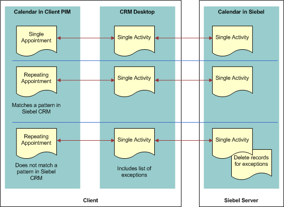Siebel CRM Desktop for Microsoft Outlook Administration Guide > How Siebel CRM Desktop Handles Siebel CRM Data > How Siebel CRM Desktop Handles Microsoft Outlook Calendar Data > How Siebel CRM Desktop Handles a Repeating Calendar AppointmentA repeating calendar appointment is a calendar appointment that repeats at a specified interval. Siebel CRM Desktop supports synchronizing a repeating calendar appointment between Microsoft Outlook and the Siebel Server, but it handles a repeating pattern differently for the Outlook calendar appointment than it does for a Siebel calendar activity. Figure 8 illustrates how CRM Desktop handles a repeating calendar appointment. For more information, see How Siebel CRM Desktop Maps Fields Between Siebel CRM Data and Microsoft Outlook Data. |