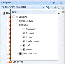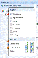 The Navigator control contains the hierarchy navigator panel. The navigator control can be minimized and closed using the icons on the navigator header. The control can also be resized.
