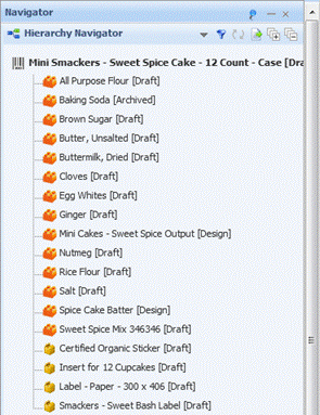 The navigator is a control that floats on top of the active object on the right. In the example below the navigator was launched from the “Mini Cakes – Sweet Spice” formulation specification. You can then use the hierarchy to navigate to individual specifications. In the example below the “Vanilla Extract” material specification is open while the “Mini Cakes – Sweet Spice” hierarchy is still presented. Notice how the open specification appears bolded letting you know where exactly you are within the hierarchy.