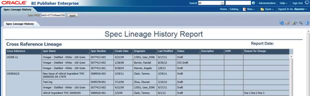 Interactive table displaying Spec Name, Spec Number, Create Date, Originator, Last Modified, Status Pack Size Description, Pack Size UOM and Reason for Change by equivalent number. |